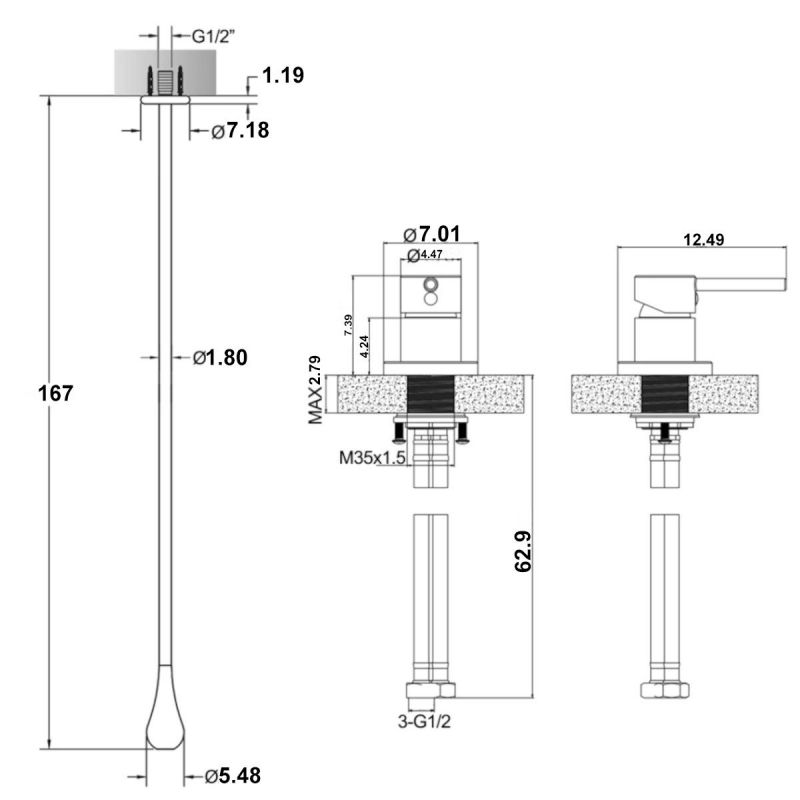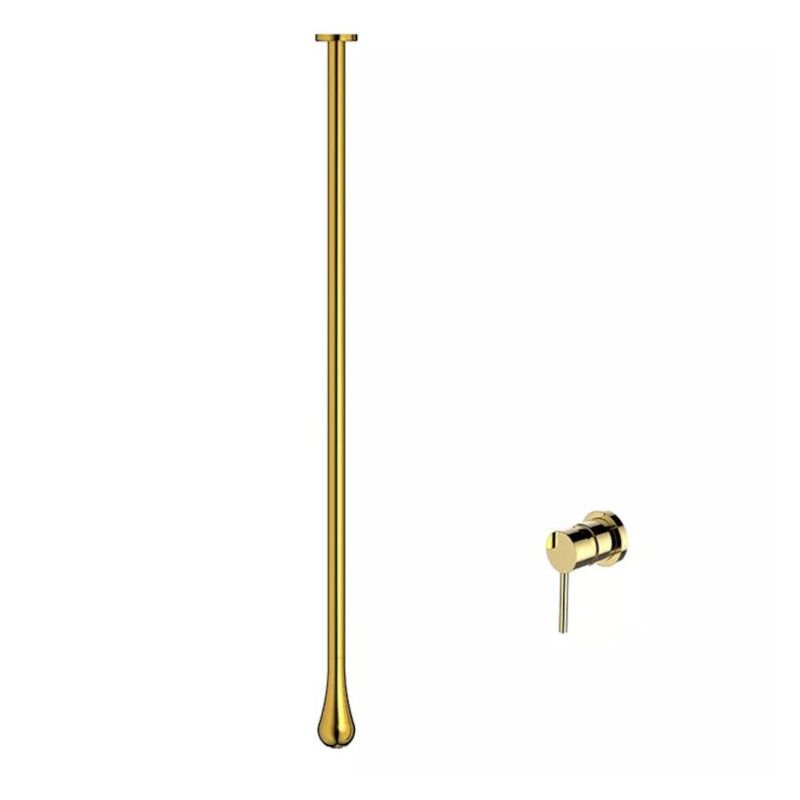 Die Maty-Armatur verfügt über eine einzigartige Deckenmontage, während der Umschalter für Warm- und Kaltwasser wandbündig installiert wird.