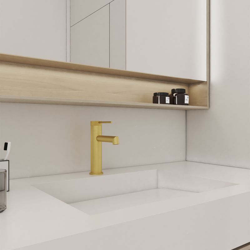 Modernes und elegantes Design: Die Waschbeckenarmatur Apolo in Mattgold besticht durch ihr modernes und elegantes Design und fügt sich nahtlos in jedes Badezimmerambiente ein.