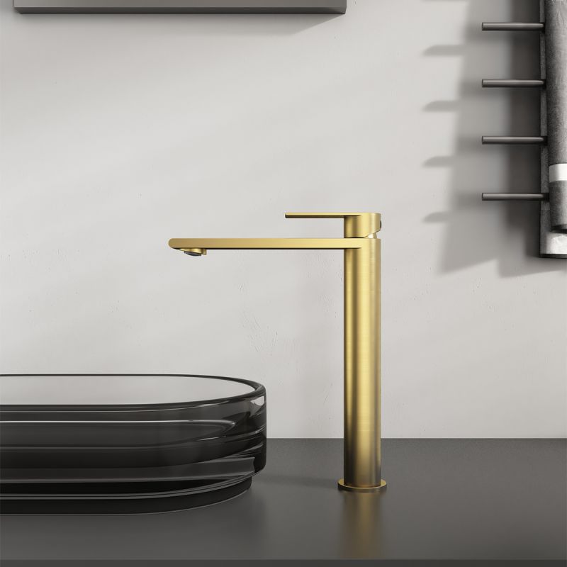 Mit einer Höhe von 28,2 cm und einem matten Gold-Finish verleiht die Sereno Armatur Raffinement und passt perfekt zu Aufsatzwaschbecken, ideal für moderne oder klassische Dekore.
