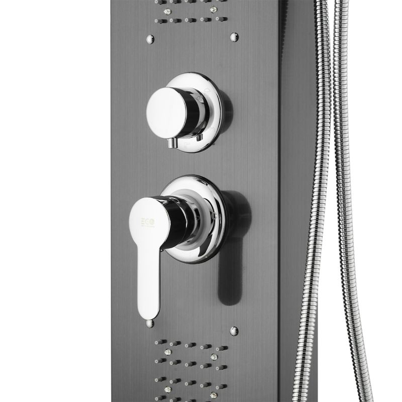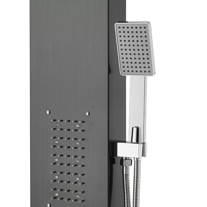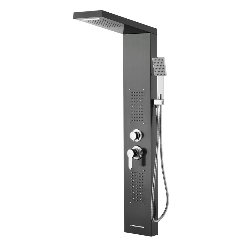 Das Aurora-Duschpaneel mit LED-Beleuchtung und schwarzem Edelstahl-Finish bringt Luxus und Komfort in Ihr Zuhause. Durch die Kombination aus modernem Design und fortschrittlicher Funktionalität bietet es ein individuelles Duscherlebnis und verwandelt Ihr Badezimmer in ein wahres Entspannungsrefugium.
