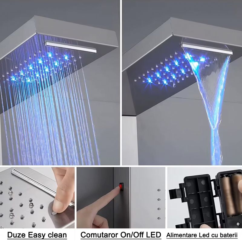 Das Panel ist mit einer batteriebetriebenen LED-Beleuchtung ausgestattet, die eine elegante Atmosphäre schafft und eine entspannende Dusche ermöglicht. Das subtile Umgebungslicht verleiht eine zusätzliche Note von Raffinesse und trägt zu einem einzigartigen Duscherlebnis bei.