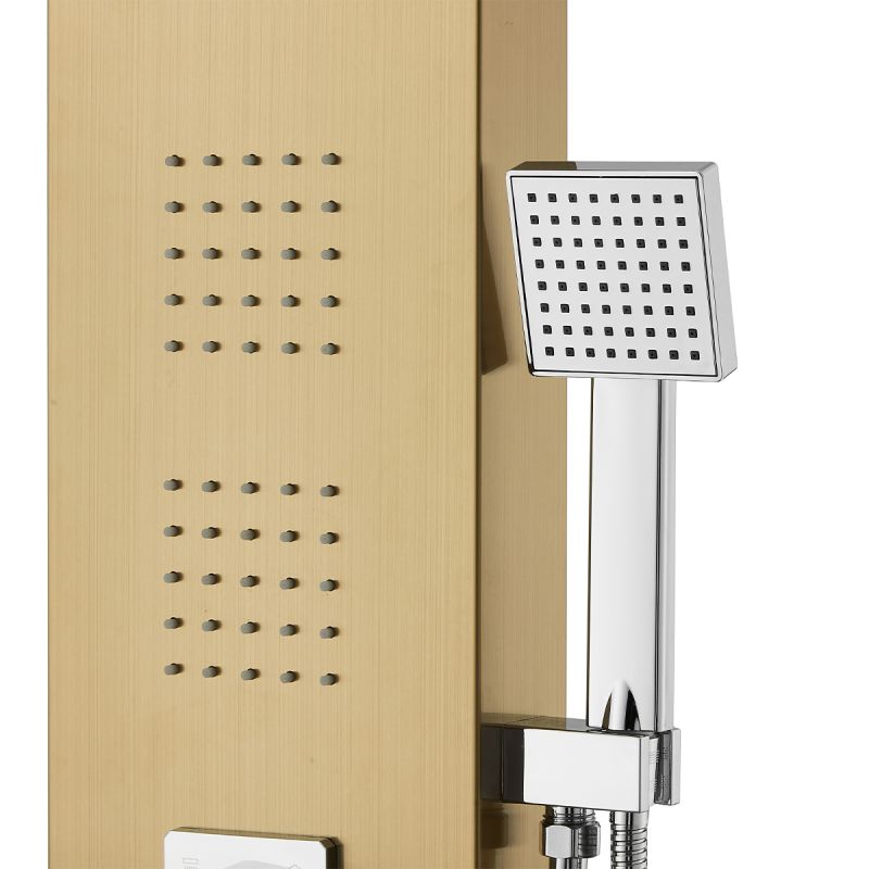 Das gebürstete Mattgold-Finish verleiht dem Panel eine luxuriöse und elegante Ausstrahlung und bringt Glanz und Raffinesse in jedes Badezimmer. Sein modernes Design passt zu einer Vielzahl von Einrichtungsstilen, von klassisch bis zeitgenössisch. Die ergonomisch platzierten quadratischen Knöpfe ermöglichen eine einfache Bedienung und schnellen Wechsel zwischen den Funktionen.