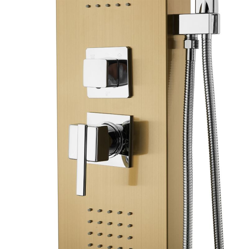 Das Infinity Duschpaneel mit LED-Beleuchtung und Mattgold-Finish ist die ideale Lösung für alle, die ihr Badezimmer in ein Refugium der Entspannung und des Luxus verwandeln möchten. Mit elegantem Design und fortschrittlichen Funktionen bietet es ein unvergleichliches Duscherlebnis und bringt den Komfort und die Eleganz eines Fünf-Sterne-Spa direkt in Ihr Zuhause.