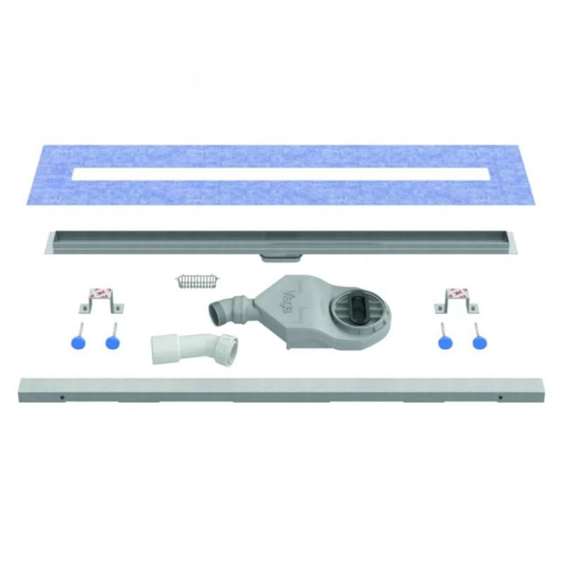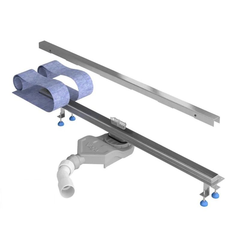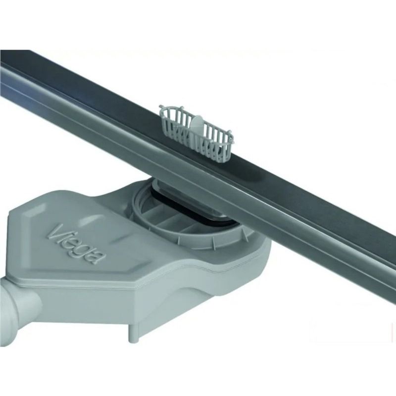 Rinne, Maske/Gitter, Siphon Viega, Siebhaar, Montagefüße, Dichtung Hülse, Deckelhebehaken, Installationsanleitung