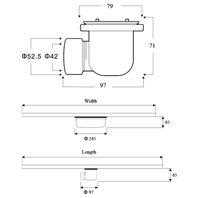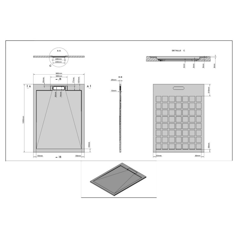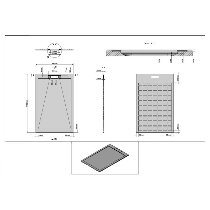 Der Abfluss ist verdeckt und verfügt über eine hohe Ablaufleistung von 24 Litern pro Minute. Er ist mit einer weißen Kunststoffabdeckung ausgestattet, mit den Maßen 29,5 x 7,5 cm und einer Dicke von 0,6 cm. Der Ablauf der Duschwanne ist nach der Norm EN 274-1:2002 zertifiziert.