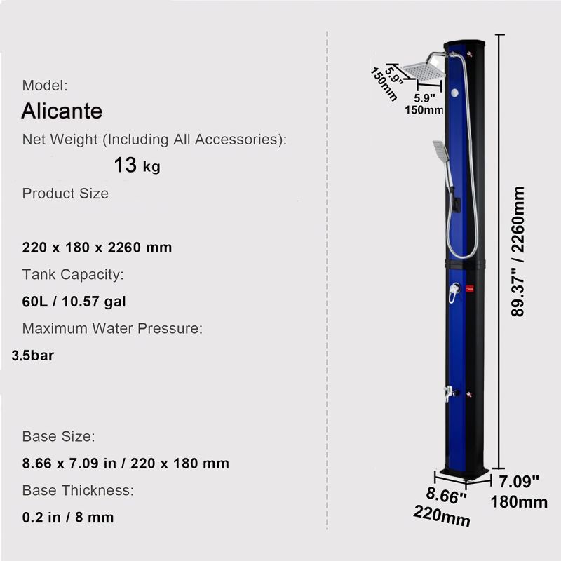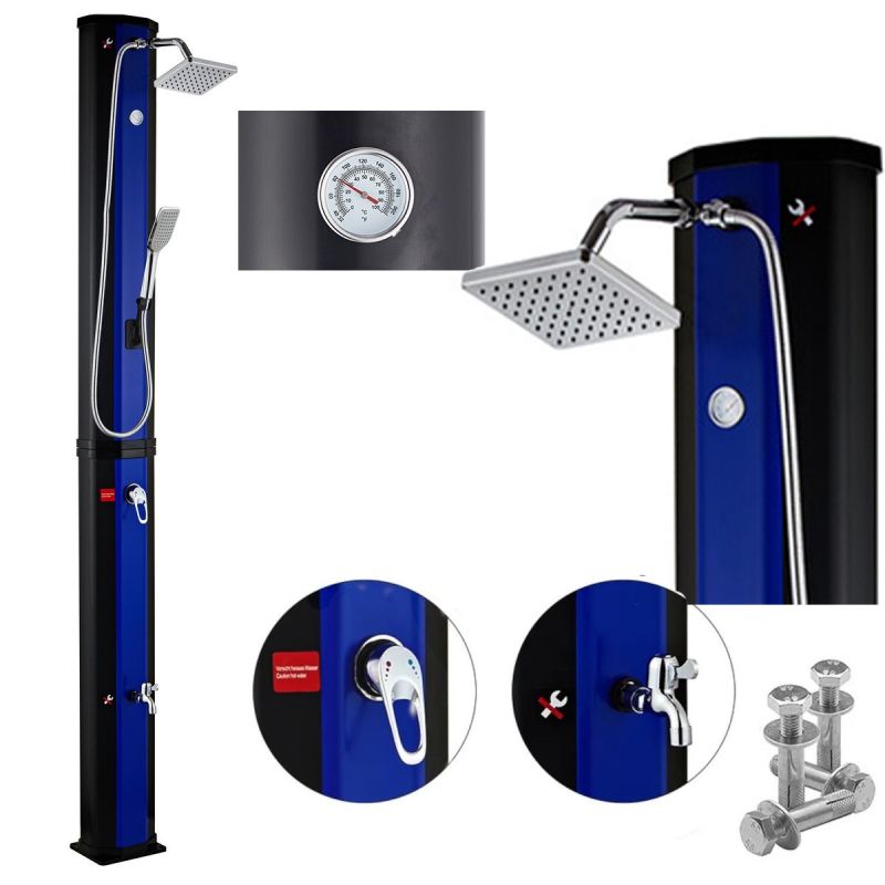 Mit der Solardusche Alicante können Sie eine entspannende und erfrischende Dusche im Freien genießen, dabei die Sonnenenergie nutzen und von zusätzlichen Funktionen wie der Fußdusche, der Handbrause und dem verstellbaren Duschkopf profitieren. Hergestellt aus hochwertigen Materialien und mit ansprechendem Design verleiht sie Ihrem Duscherlebnis zusätzlichen Komfort und Stil.
