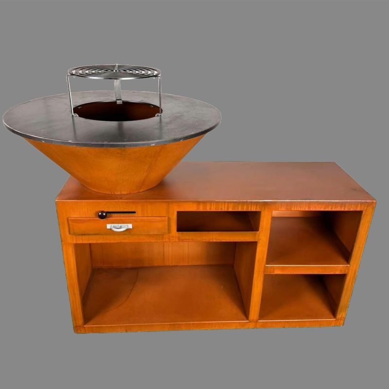 Die beiden seitlichen Regale aus Cortenstahl eignen sich ideal zur Organisation von Zutaten, Utensilien oder bereits zubereiteten Speisen, während der rechteckige Stauraum für Holz eine praktische und elegante Lösung zur Brennstoffverwaltung bietet. Die Basis mit einer Höhe von 70 cm sorgt für optimalen Bedienkomfort, reduziert körperliche Anstrengung und ermöglicht eine ergonomische Haltung beim Grillen.