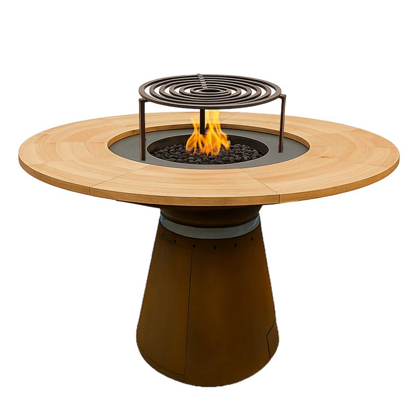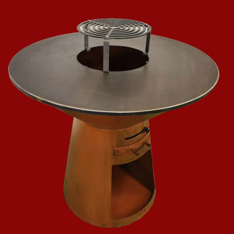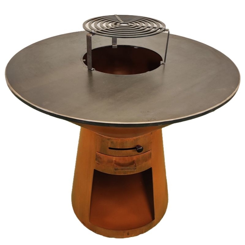 Holzgrill mit großer Kochplatte und Holzarbeitsfläche, Stauraum für Holz, 2 mm Cortenstahl, Ø 100 x H 90 cm, Avangarde