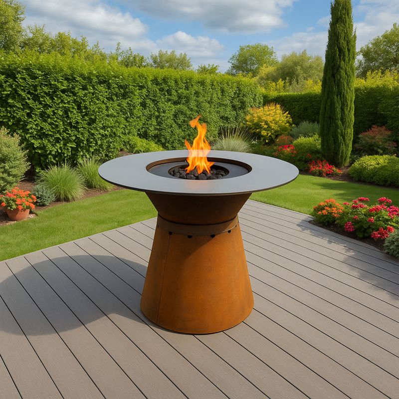 Extreme Haltbarkeit: Konstruktion aus Cortenstahl mit einer 6 mm dicken Platte und einer massiven 15 mm Arbeitsfläche, witterungs- und verschleißfest.