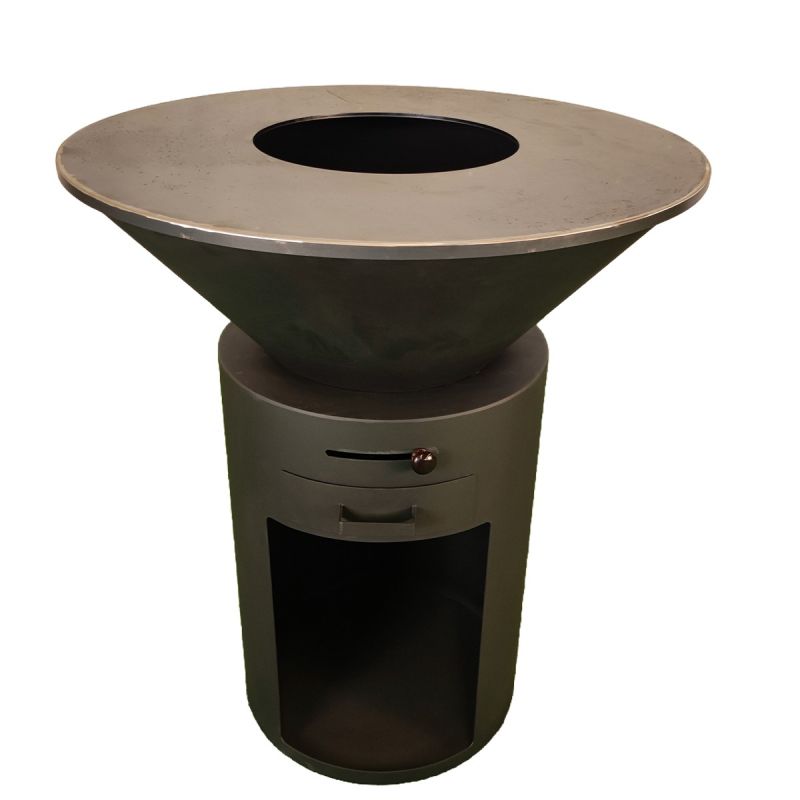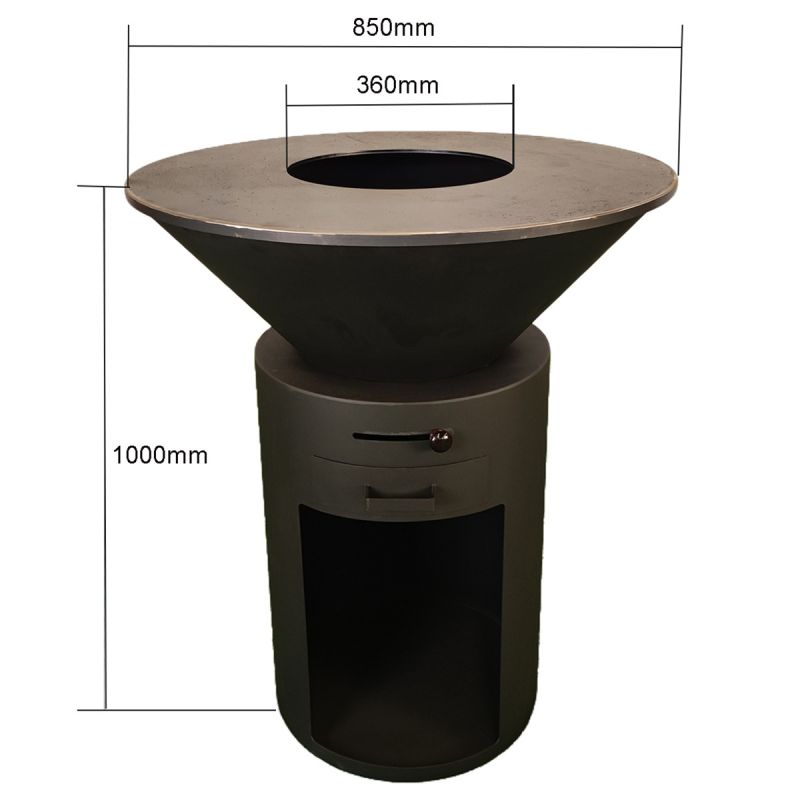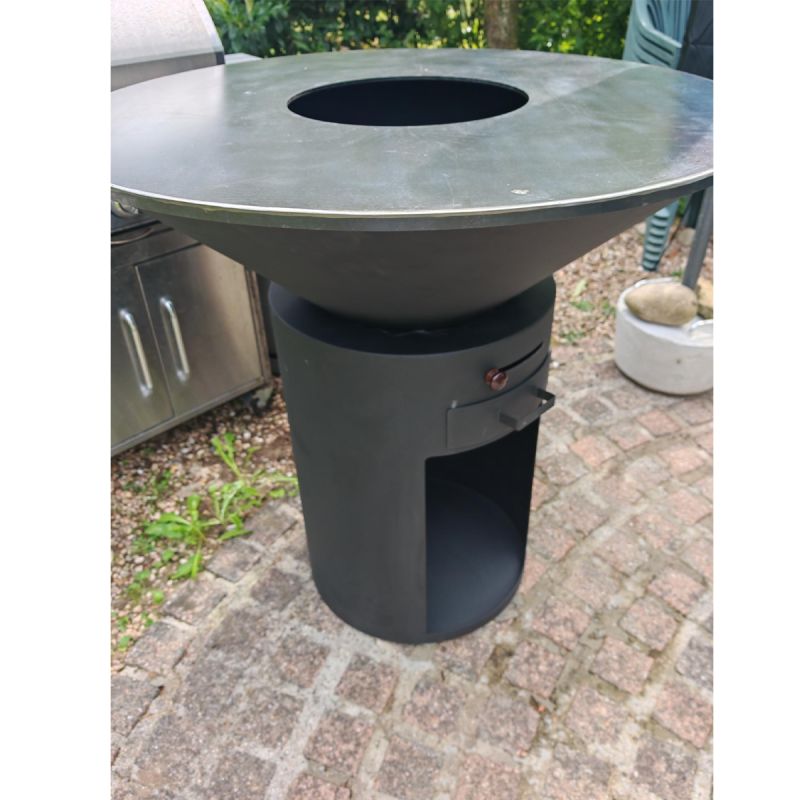 Konzipiert für Outdoor-Kochbegeisterte und Liebhaber zeitgenössischen Designs bietet der Kamin eine großzügige Kochfläche, die sich perfekt für die Zubereitung verschiedenster Speisen eignet – von Fleisch und Gemüse bis hin zu Gourmet-Spezialitäten. Im unteren Bereich befindet sich ein großzügiger Holzlagerplatz, der Ihnen stets den notwendigen Brennstoff griffbereit hält und zugleich für ein ordentliches und elegantes Gesamtbild sorgt.
