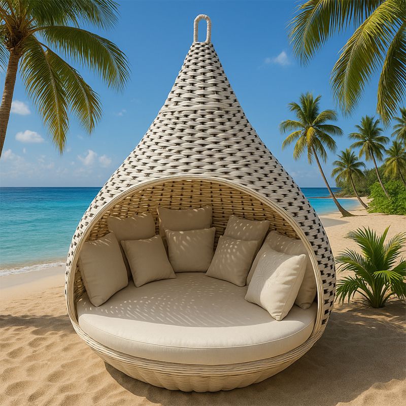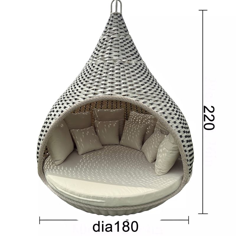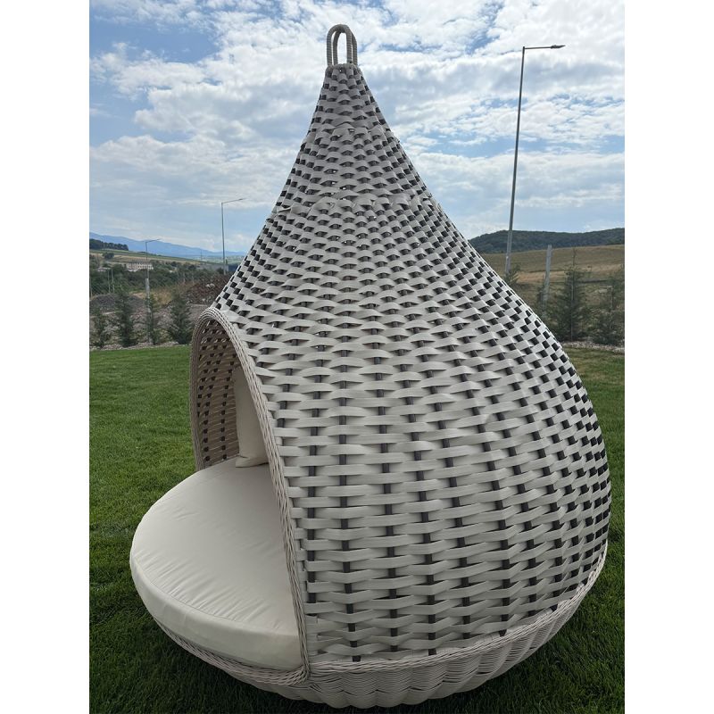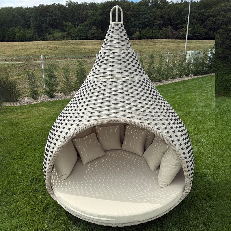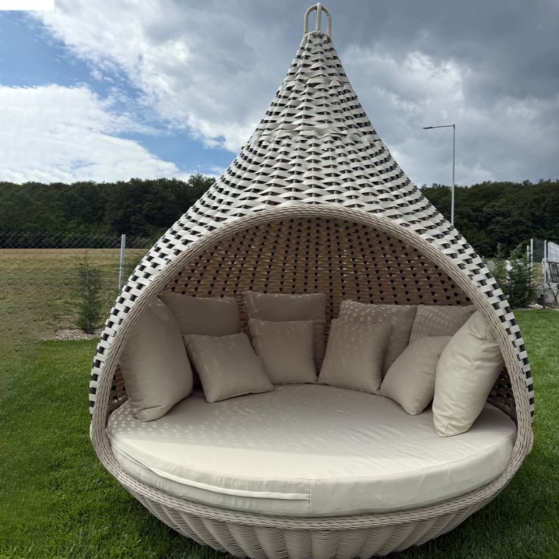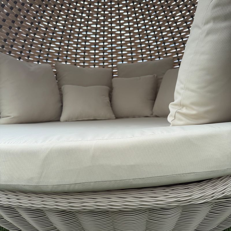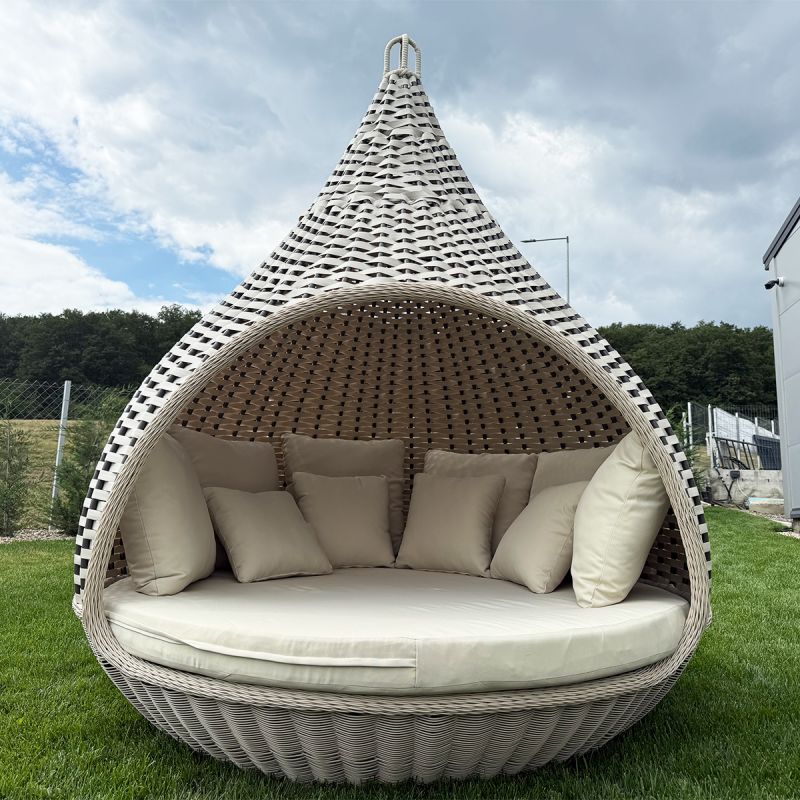 Mit einem beeindruckenden Durchmesser von 180x220 cm bietet das Rustica-Bett ausreichend Platz für zwei Personen und ist ideal für alle, die einen großzügigen Entspannungs- und Intimbereich im Freien suchen. Das runde Design und die sanften Konturen schaffen ein Gefühl von Harmonie und Eleganz, während die natürlichen Rattan-Finishes zur perfekten Integration in jedes Außenambiente beitragen, sei es rustikal, mediterran oder modern.