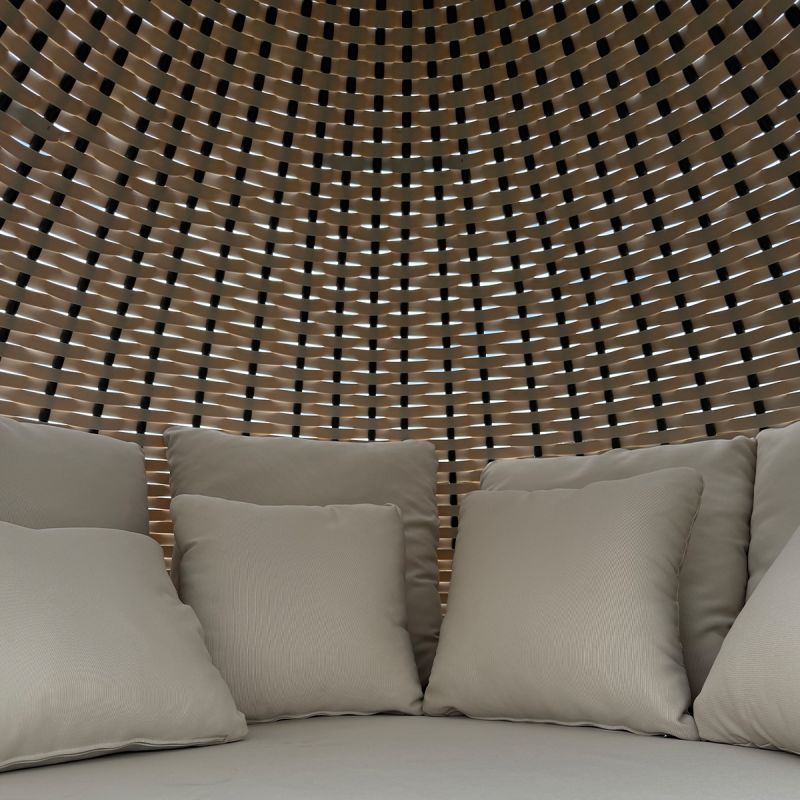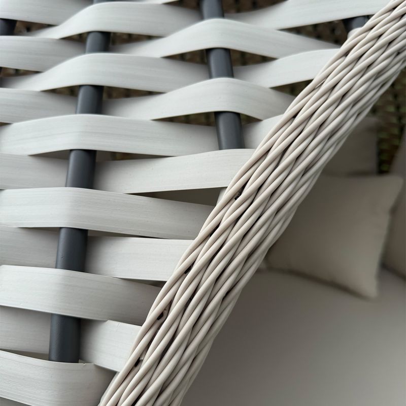 Das Geflecht ist aus breitem, flachem synthetischem PE-Rattan der neuesten Generation gefertigt – eine erstklassige Wahl für Outdoor-Möbel dank seiner hervorragenden Eigenschaften: exzellente UV-Beständigkeit, hohe Flexibilität, Widerstandsfähigkeit gegen Feuchtigkeit, Schimmel und Bakterien sowie eine gesteigerte Fähigkeit, vorzeitiger Alterung und Umwelteinflüssen zu widerstehen. Dieses Material benötigt nur minimale Pflege und behält sein makelloses Aussehen über lange Zeit.