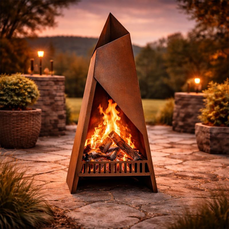 Die pyramidenförmige Form, ergänzt durch klare und ausdrucksstarke Linien, macht diesen Kamin zu einem zentralen Designelement für jeden Außenbereich.