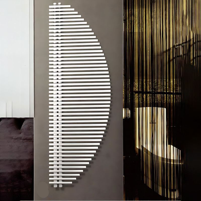 Das zentrale Merkmal dieses Heizkörpers ist seine gebogene, progressive Form, die eine elegante Dynamik an der Wand erzeugt und das Funktionale dekorativ macht. Die dünnen, perfekt ausgerichteten horizontalen Stäbe folgen einer aufsteigenden, fließenden Linie und bieten eine bemerkenswerte ästhetische Alternative zu geraden oder Standardmodellen. Die Form ist nicht nur optisch ansprechend – sie bietet optimalen Platz zum Trocknen der Handtücher, ohne das Raumdesign zu stören.