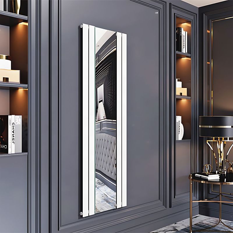 Multifunktionales Design – vereint die Eleganz eines vertikalen Spiegels mit der Leistung eines Heizkörpers. Er schafft Helligkeit, Raumtiefe, spart Platz und bietet mit 593 Watt effiziente Wärme.