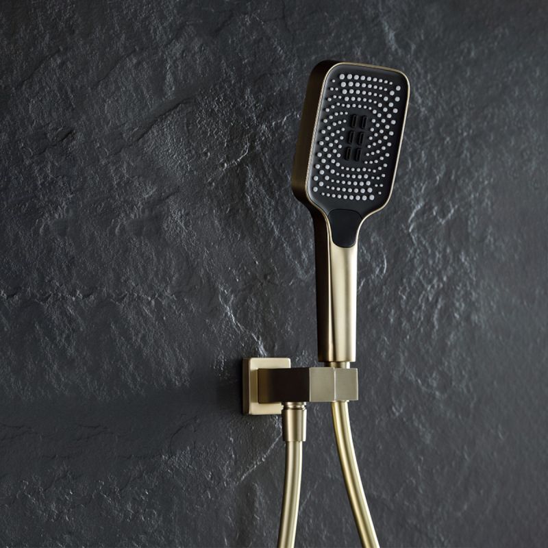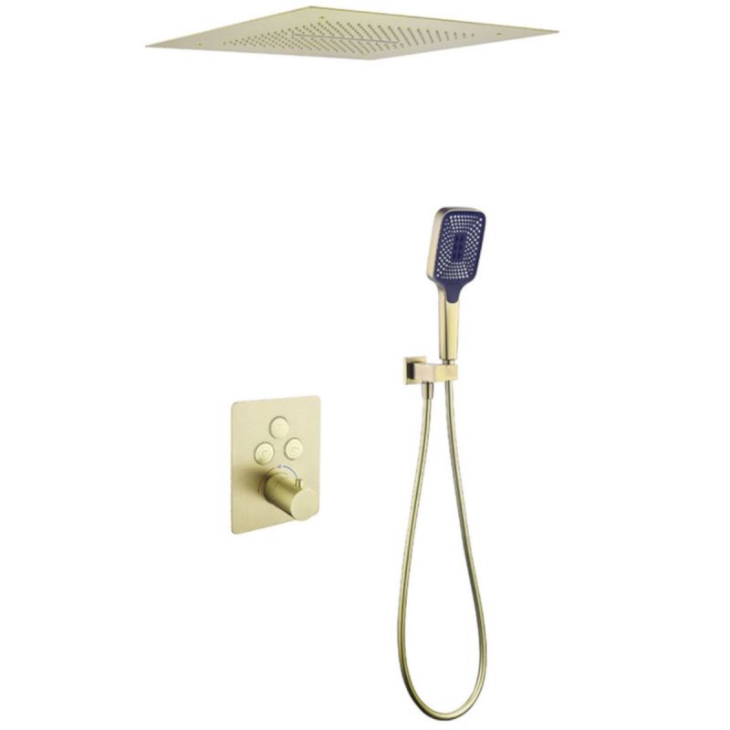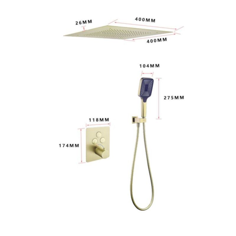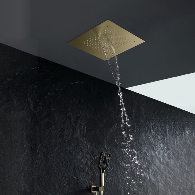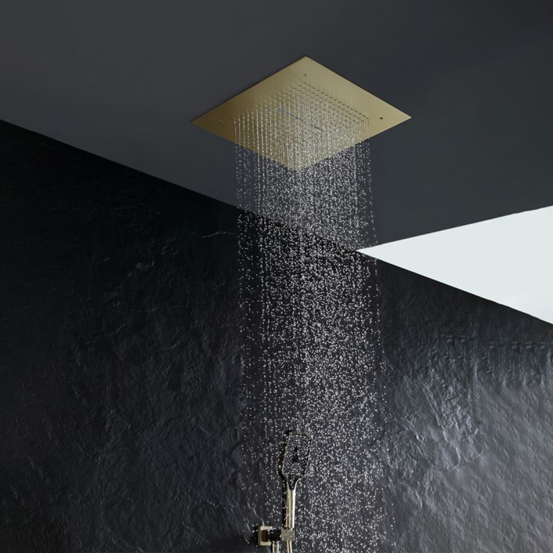 Das Duschsystem „Amigo“ zeichnet sich aus durch Das Finish oder Mattgold verleiht Ihrem Badezimmer einen Hauch von Glanz und Eleganz. Das innovative Design umfasst sowohl eine Regendusche als auch eine Dusche mit Wasserfalleffekt, die ein Gefühl von Verwöhnung und Raffinesse erzeugt. Die Installation ist in die Decke eingebaut und bietet ein klares und minimalistisches Erscheinungsbild, wobei alle Komponenten in Ihrer Wand oder Decke versteckt sind.