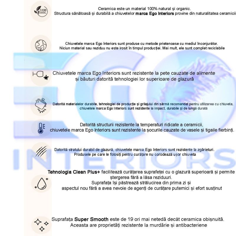 Die keramischen Spülen der Marke Ego Interiors erneuern nicht nur den Stil der Küche, sondern bieten auch eine gesunde Nutzung dank ihrer zu 100 % natürlichen Struktur. Die Spülen sind fleckenresistent und leicht zu reinigen, da ihre Oberflächen 19-mal glatter sind. Sie behalten ihr Aussehen über Jahre hinweg wie am ersten Tag, dank ihrer hitze- und stoßfesten Oberfläche.