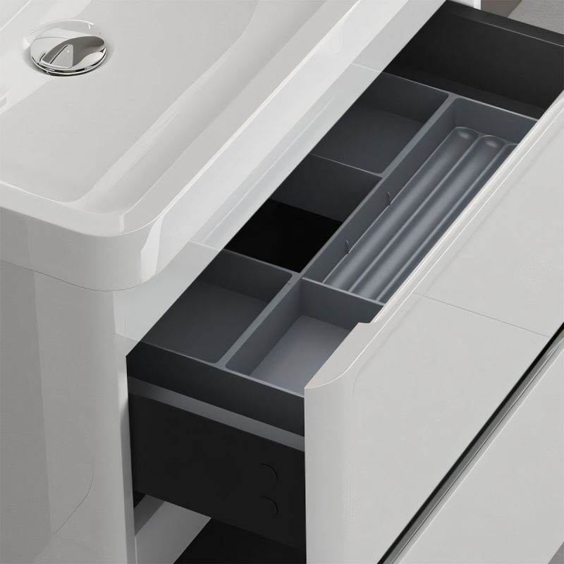 Der Möbelkorpus ist mit zwei geräumigen Schubladen ausgestattet, die sich perfekt zur effizienten Organisation von Handtüchern, Kosmetika und Hygieneartikeln eignen. Die Schubladen verfügen über hochwertige Soft-Close-Metallschienen, die ein sanftes und leises Schließen gewährleisten, die Lebensdauer des Möbels verlängern und ein Premium-Benutzererlebnis bieten.