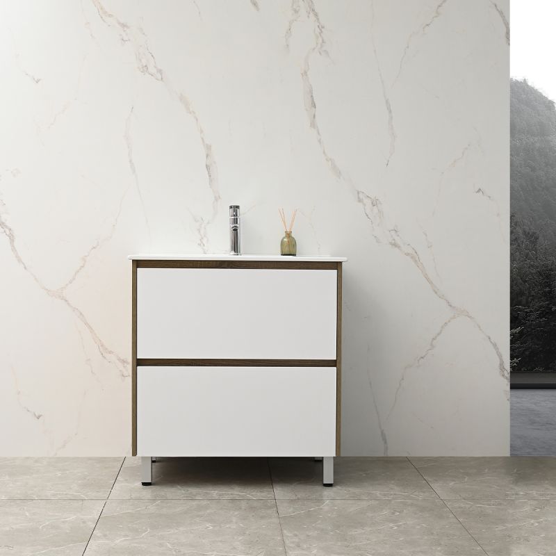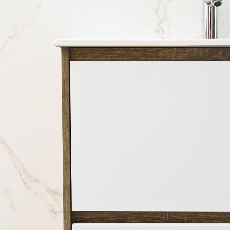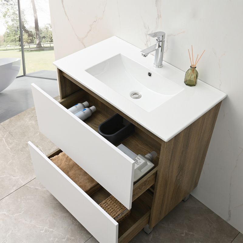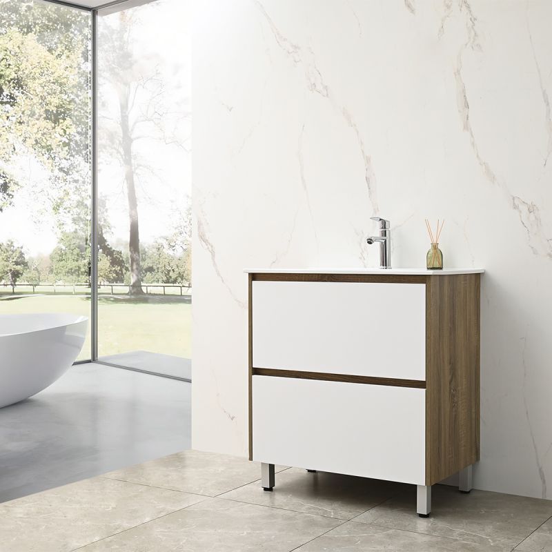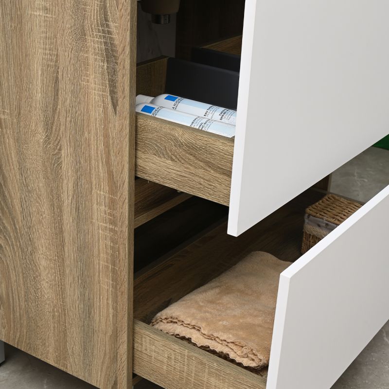 Das Möbelstück besteht aus 15 mm starkem Schichtholz (Plywood) – feuchtigkeitsbeständig, langlebig und ideal für Räume mit hoher Luftfeuchtigkeit wie das Badezimmer. Der warme Eichenton verleiht eine natürliche Ausstrahlung, während die weißen Schubladen einen eleganten Kontrast schaffen – passend für moderne wie klassische Badezimmer.