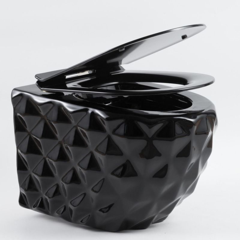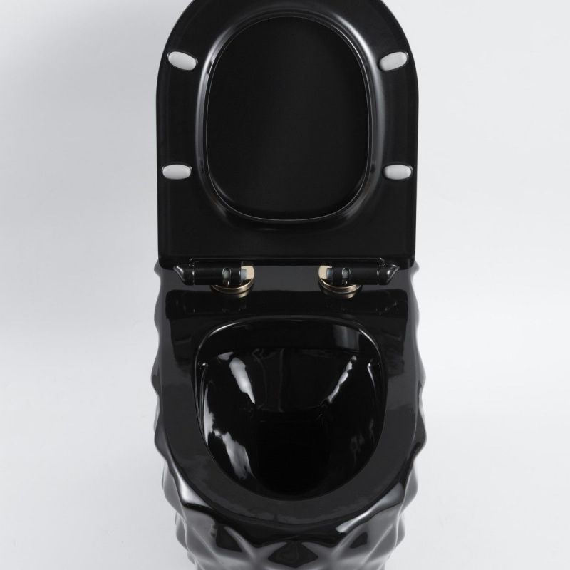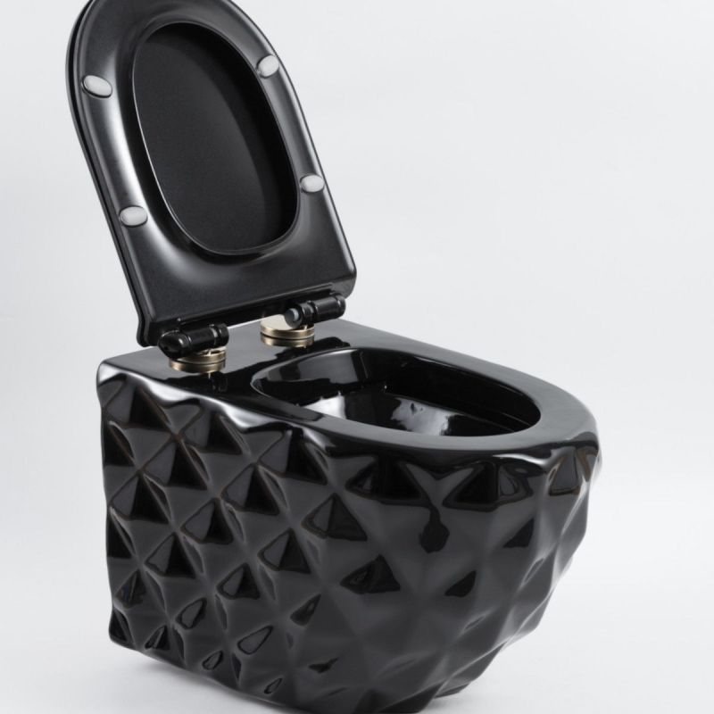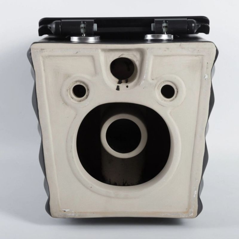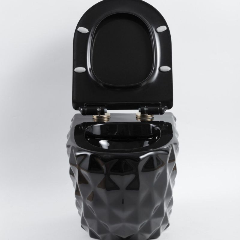 Toilettenschüssel mit glänzender, schwarzer Duroplast-Abdeckung, die äußerst kratzfest ist.
