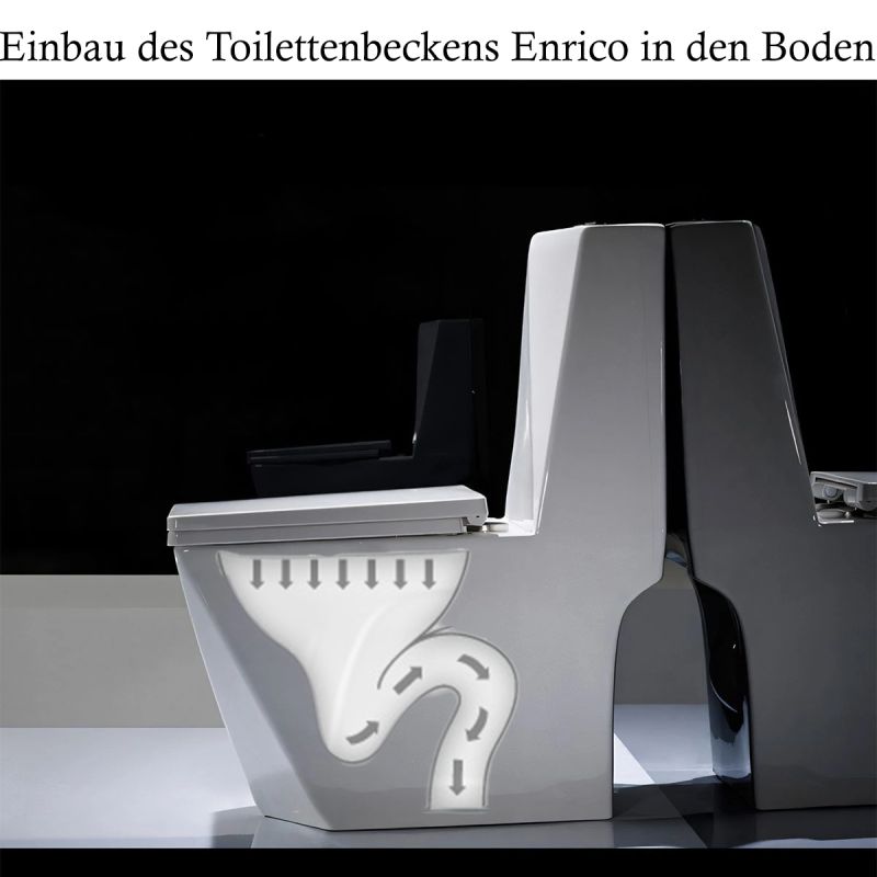 Die Enrico-Toilettenschüssel wird mit innovativer Technologie aus einem Stück gefertigt, wobei der Tank integriert ist. Dies verleiht dem Produkt ein modernes und minimalistisches Design.