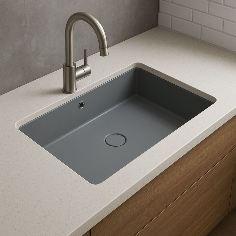 Dank der Unterbau-Montage entsteht eine fließende, aufgeräumte Optik, bei der die Waschbeckenränder unsichtbar bleiben und die Struktur sowie Farbe der Arbeitsplatte zur Geltung kommen. Das Mattgrau-Finish mit seinen natürlichen, tiefen Tönen bringt Ruhe und Ausgewogenheit ins Bad – perfekt kombinierbar mit Stein, Holz oder Metall.