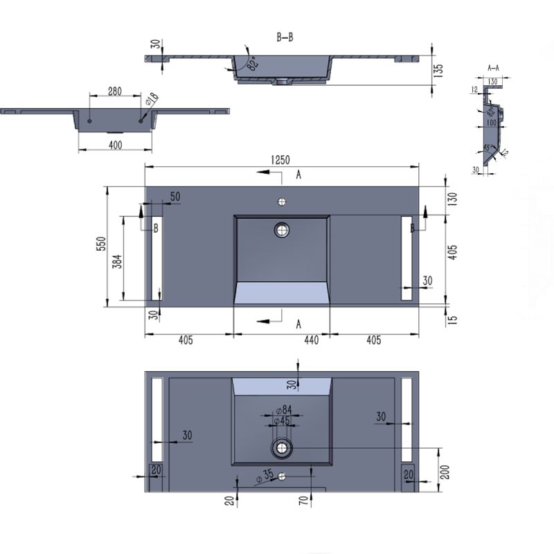 Mit einer Breite von 125 cm und einer Tiefe von 55 cm bietet das Waschbecken eine großzügige Nutzungsfläche – ideal für viel genutzte Badezimmer oder Familien. Die dezent integrierten zwei seitlichen Handtuchhalter schaffen eine intelligente Organisationslösung, die Handtücher griffbereit hält, ohne zusätzlichen Platz zu beanspruchen.