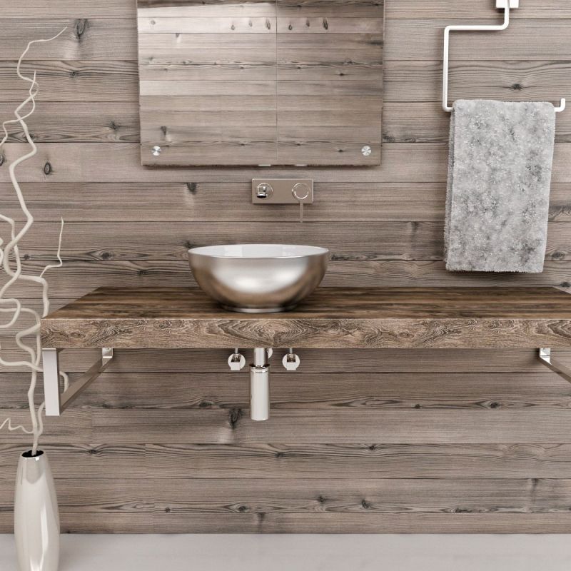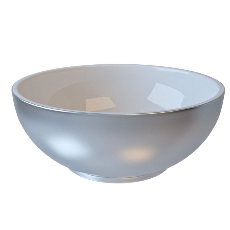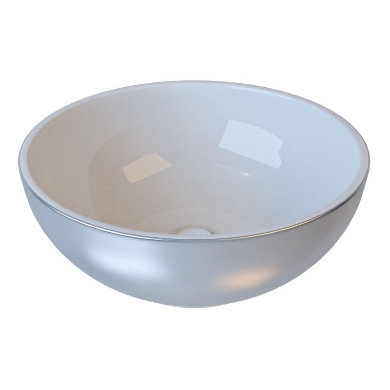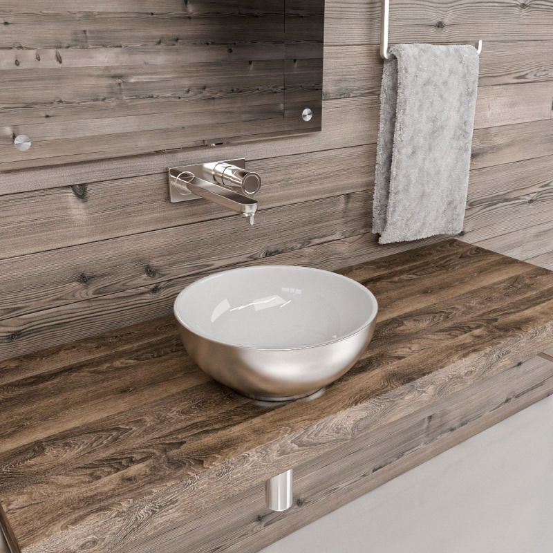 Es handelt sich um ein Waschbecken ohne Armaturloch zur Aufsatzmontage mit glatten Kanten. Das Cristiano Waschbecken hat außen einen glänzend silbernen Farbton und ist innen weiß.