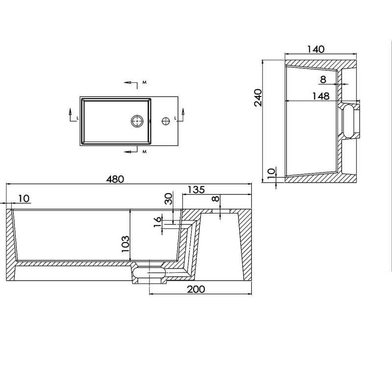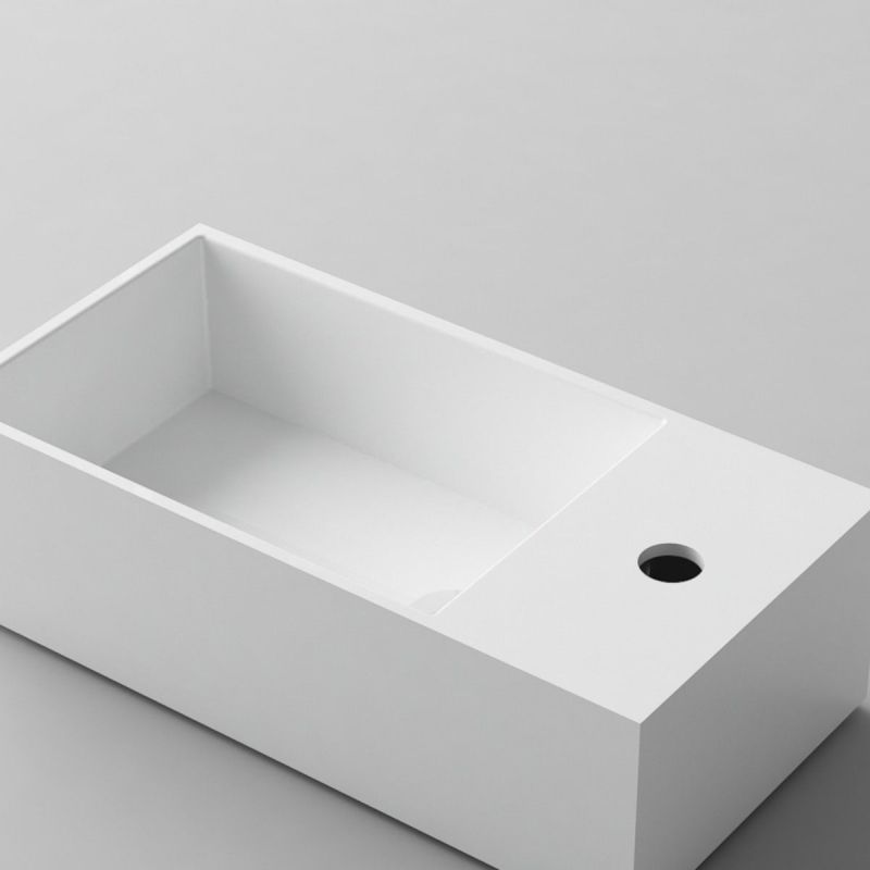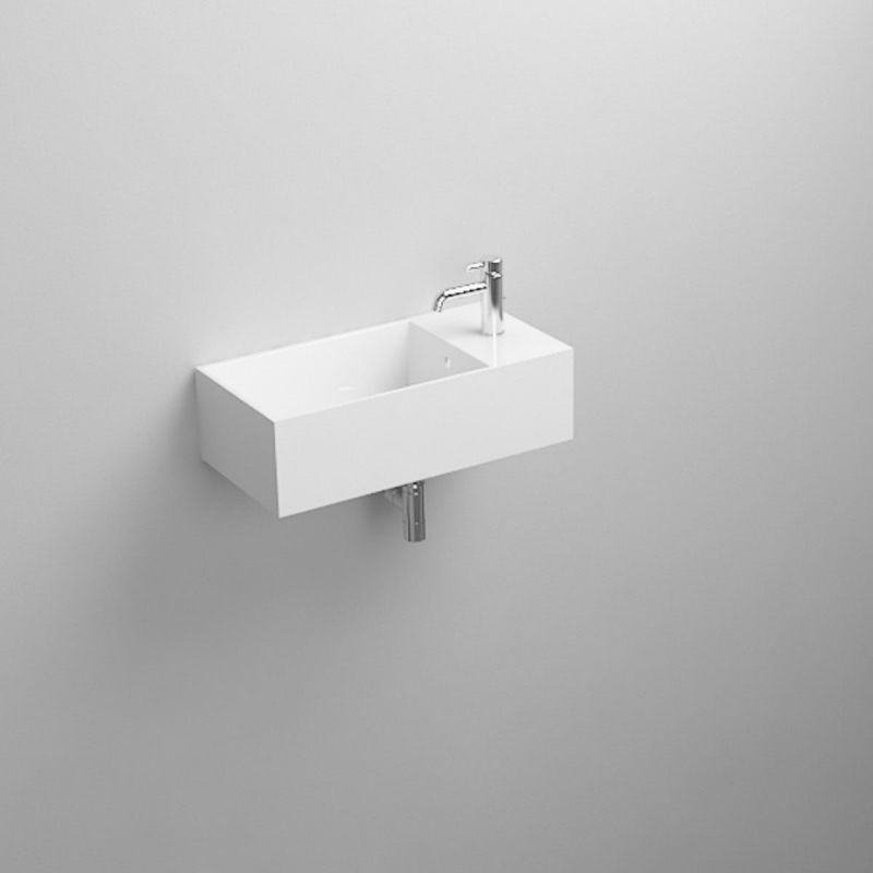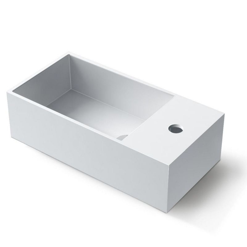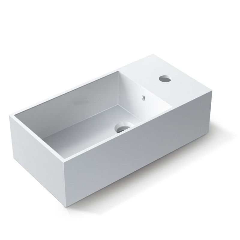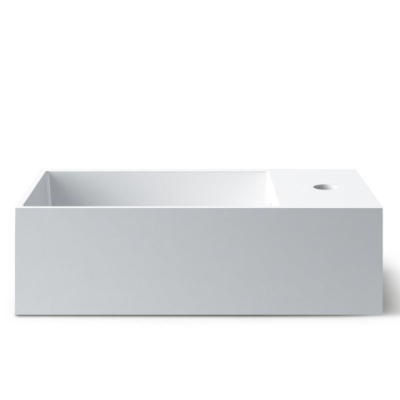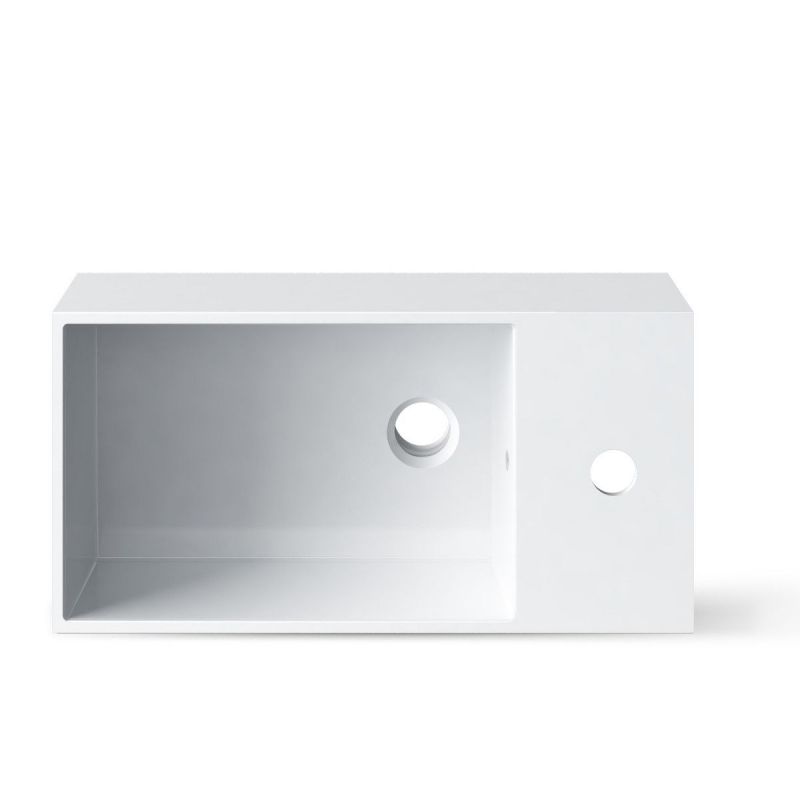 Das Waschbecken ist auf der rechten Seite mit einem Loch für die Armatur sowie einem Überlauf ausgestattet.