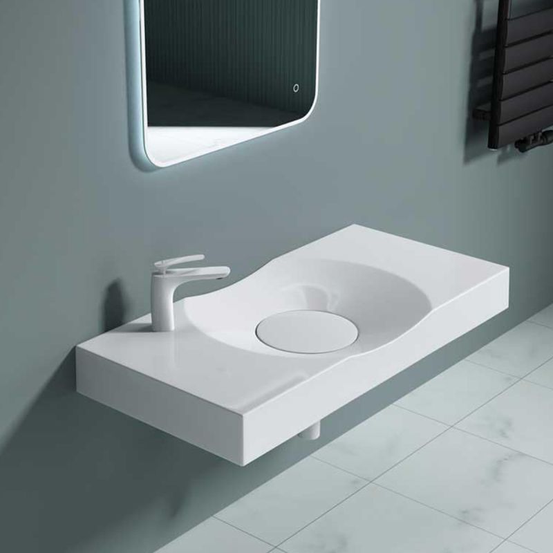 Details machen den Unterschied! Das Waschbecken ist mit einem eleganten Ablaufdeckel ausgestattet, der das moderne Design vervollständigt und dem Waschbecken ein einheitliches, raffiniertes Erscheinungsbild verleiht. Dieser Deckel verbessert nicht nur die Ästhetik, sondern erleichtert auch die tägliche Wartung.