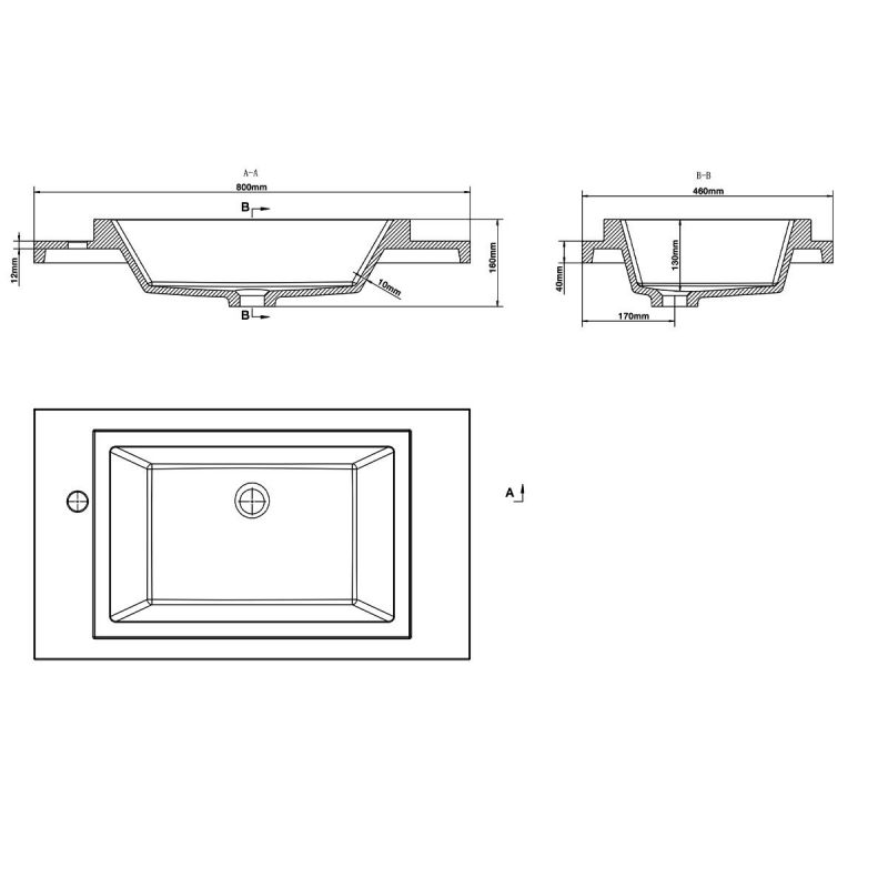 Das Waschbecken ist mit einem Hahnloch auf der linken Seite und ohne Überlauf ausgestattet.