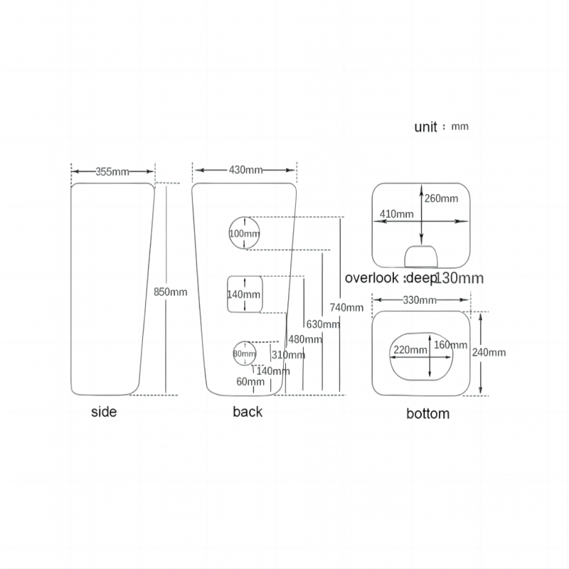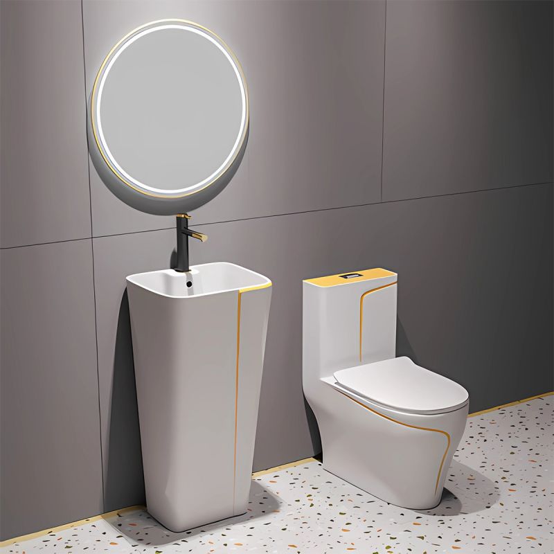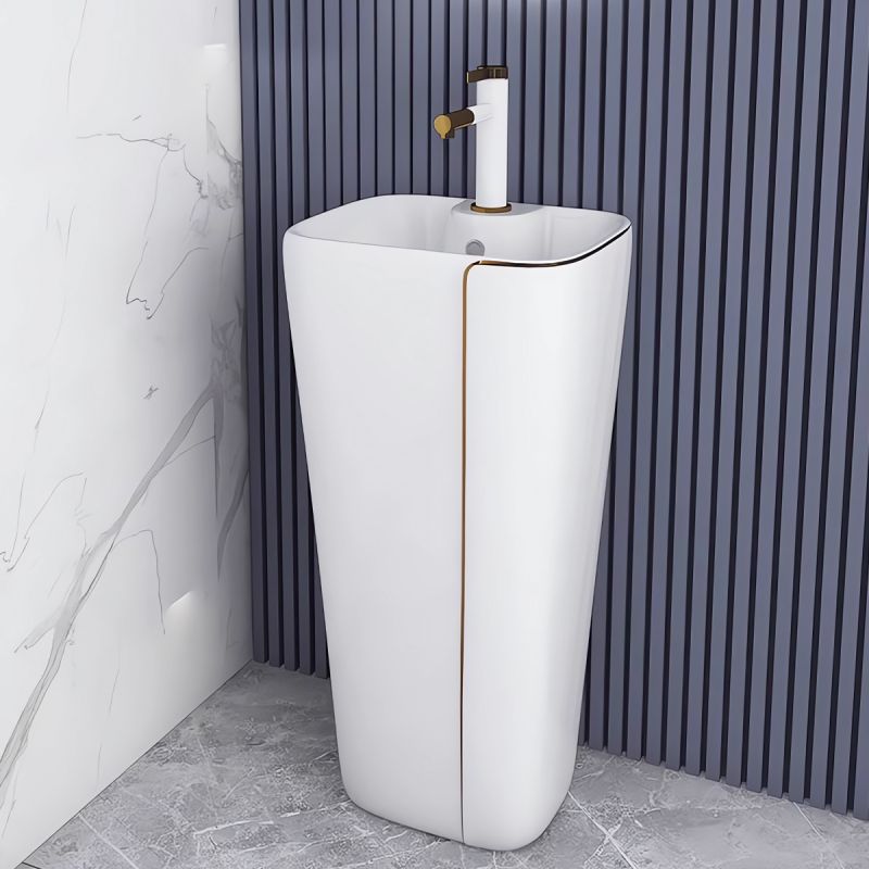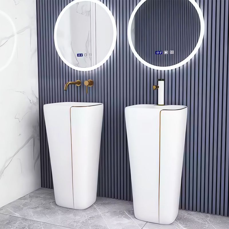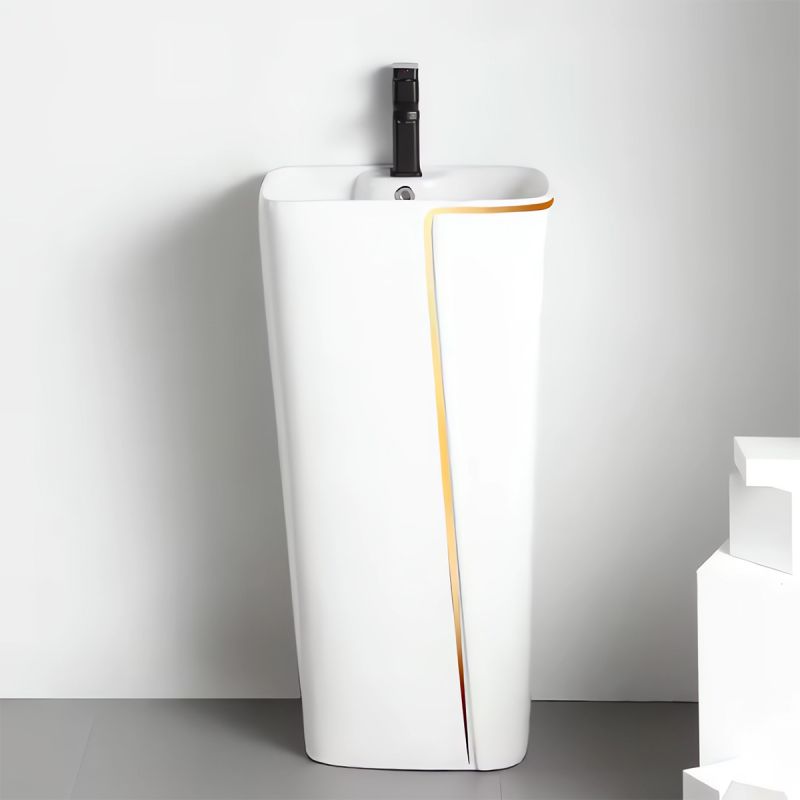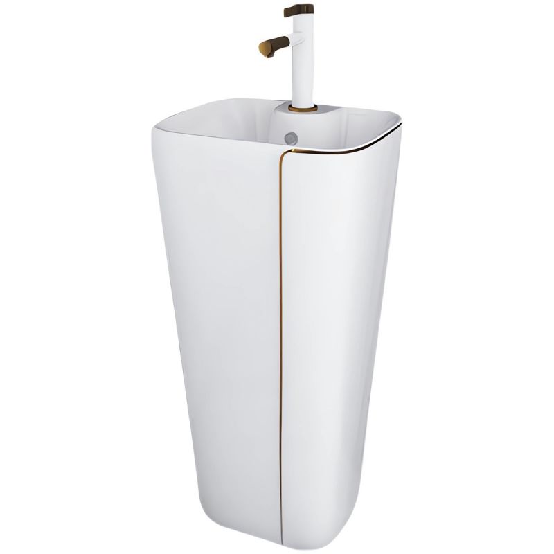 Jedes Detail dieses Waschbeckens wurde sorgfältig durchdacht, um eine problemlose und komfortable Nutzungserfahrung zu bieten. Auf dem Boden montiert und mit einem Armaturenloch ausgestattet, fügt es sich perfekt in das Design Ihres Badezimmers ein und bietet gleichzeitig makellose Funktionalität.