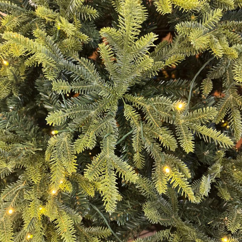 Der Baum besteht zu 75 % aus Polyethylen (PE) und imitiert die natürlichen Zweige täuschend echt, die aussehen und sich anfühlen wie echte Tannennadeln. Die 6190 üppigen Zweige sind so gestaltet, dass sie eine dichte und ansprechende Krone bilden, ergänzt durch 25 % PVC, das für ein voluminöses und vollständiges Erscheinungsbild sorgt. Mit einem Durchmesser von ca. 165 cm (abhängig von der Anordnung der Zweige) verleiht er jedem geräumigen Raum eine eindrucksvolle Präsenz.